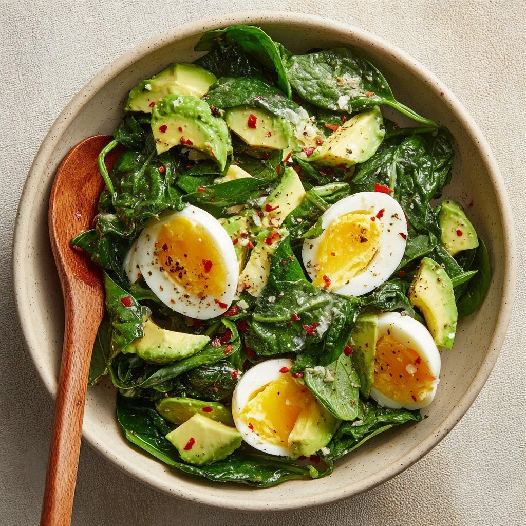 I’ll be honest—after the first batch, I ate half before anyone else got to try it. Most recipes get this completely wrong by tossing raw spinach or over‑cooking the eggs, but here we use a technique that locks in flavor while keeping the spinach tender but still vibrant. The dressing coats the avocado like velvet, and the eggs are cooked to the perfect runny consistency that melts into the bowl. Picture yourself pulling this out of the pan, the whole kitchen smelling incredible, and watching the golden yolks drip into the creamy avocado. Stay with me here—this is worth it.